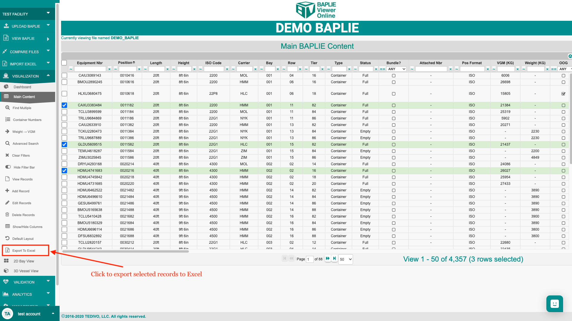 Navigate to the Main Content tab by clicking the Function Menu on the right side of the screen. Click the Export to Excel button in the bottom left corner at any time to export the BAPLIE data on your screen into an Excel spreadsheet. The export will download immediately.
