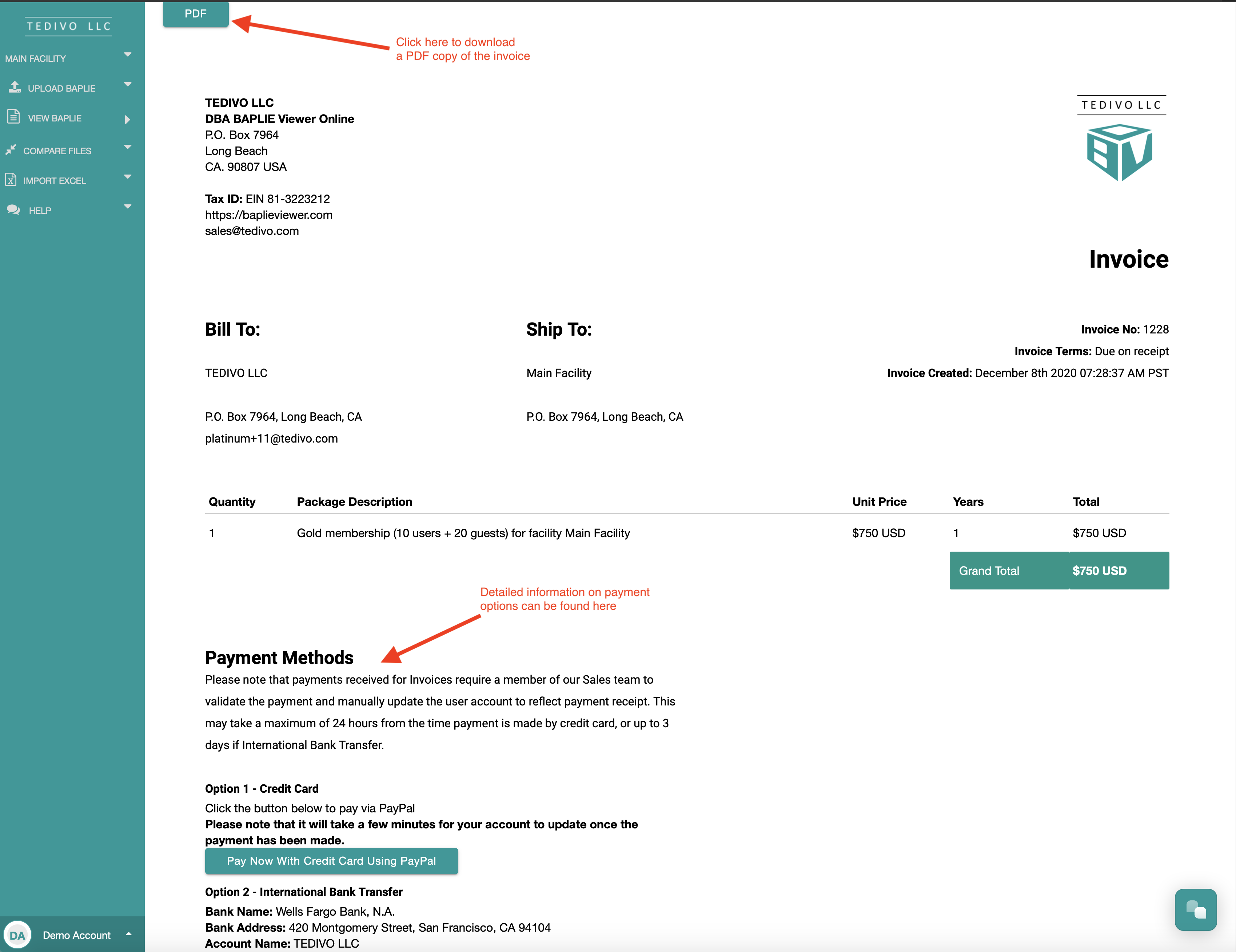 When you select Pay By Invoice, an invoice will automatically be generated and appear on the next page. Feel free to pay the invoice immediately, using either the PayPal or International Bank Transfer options described at the bottom of the invoice. Alternatively, you can download the invoice as a PDF.