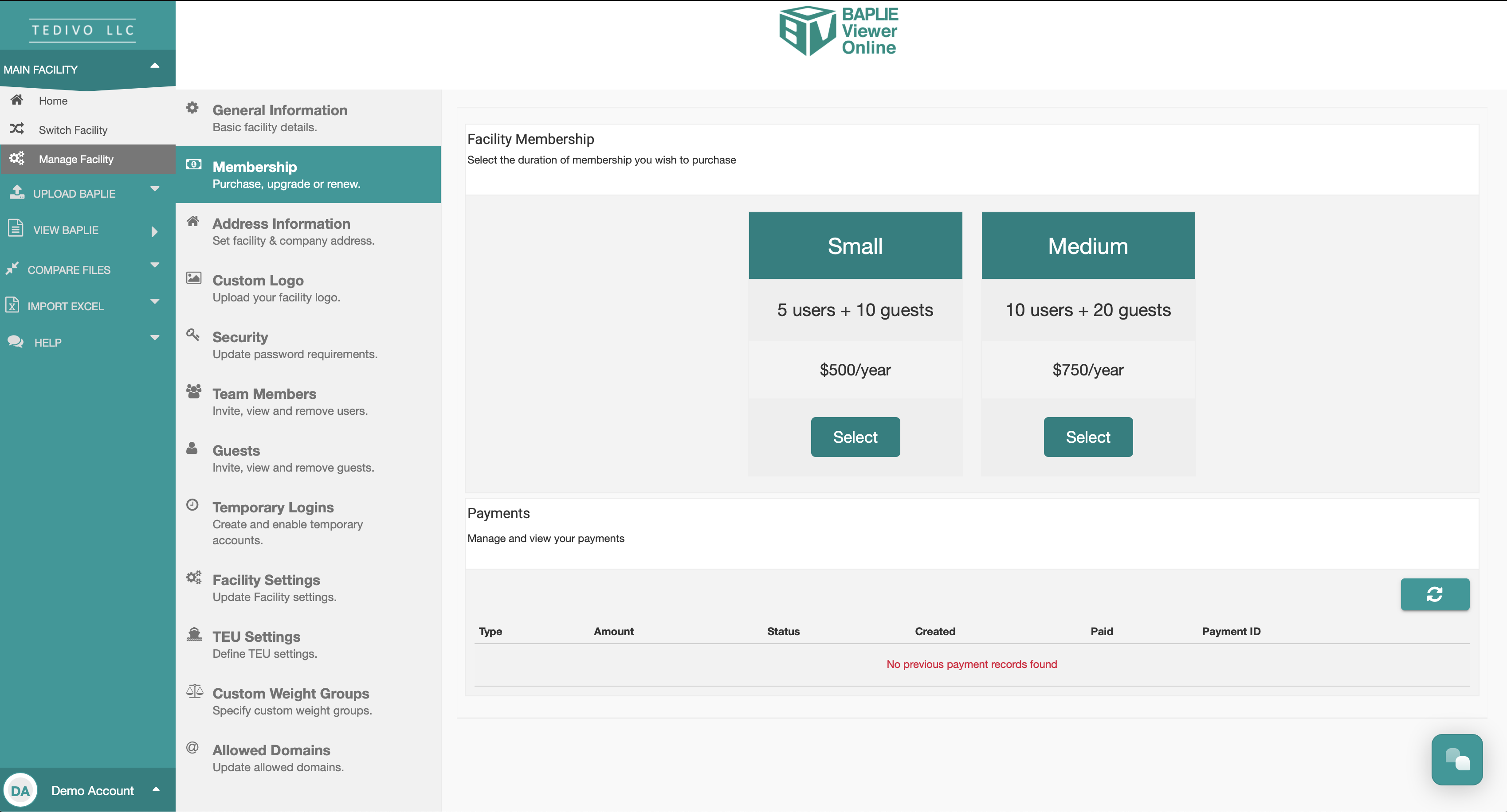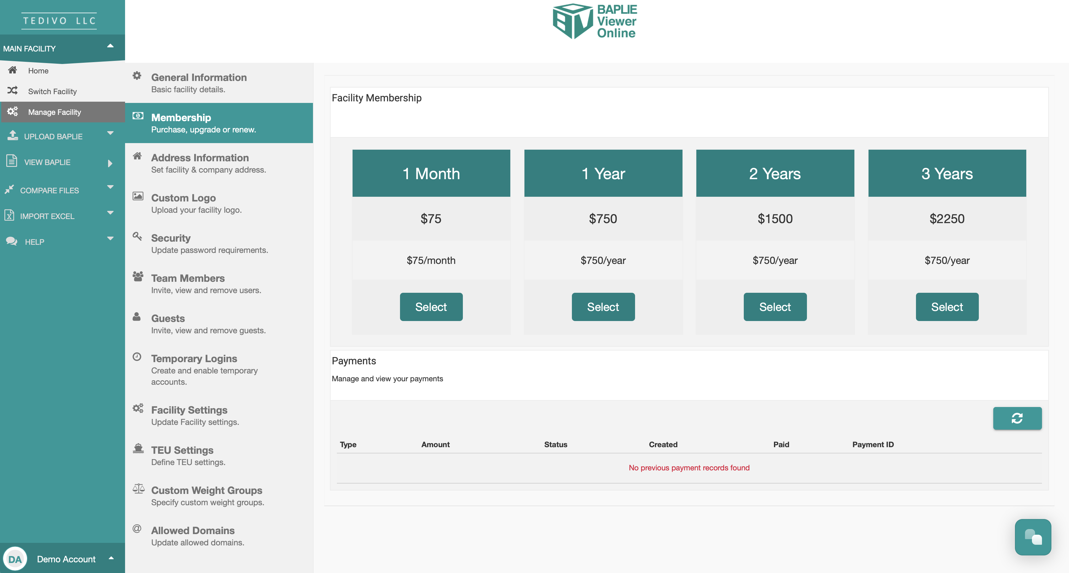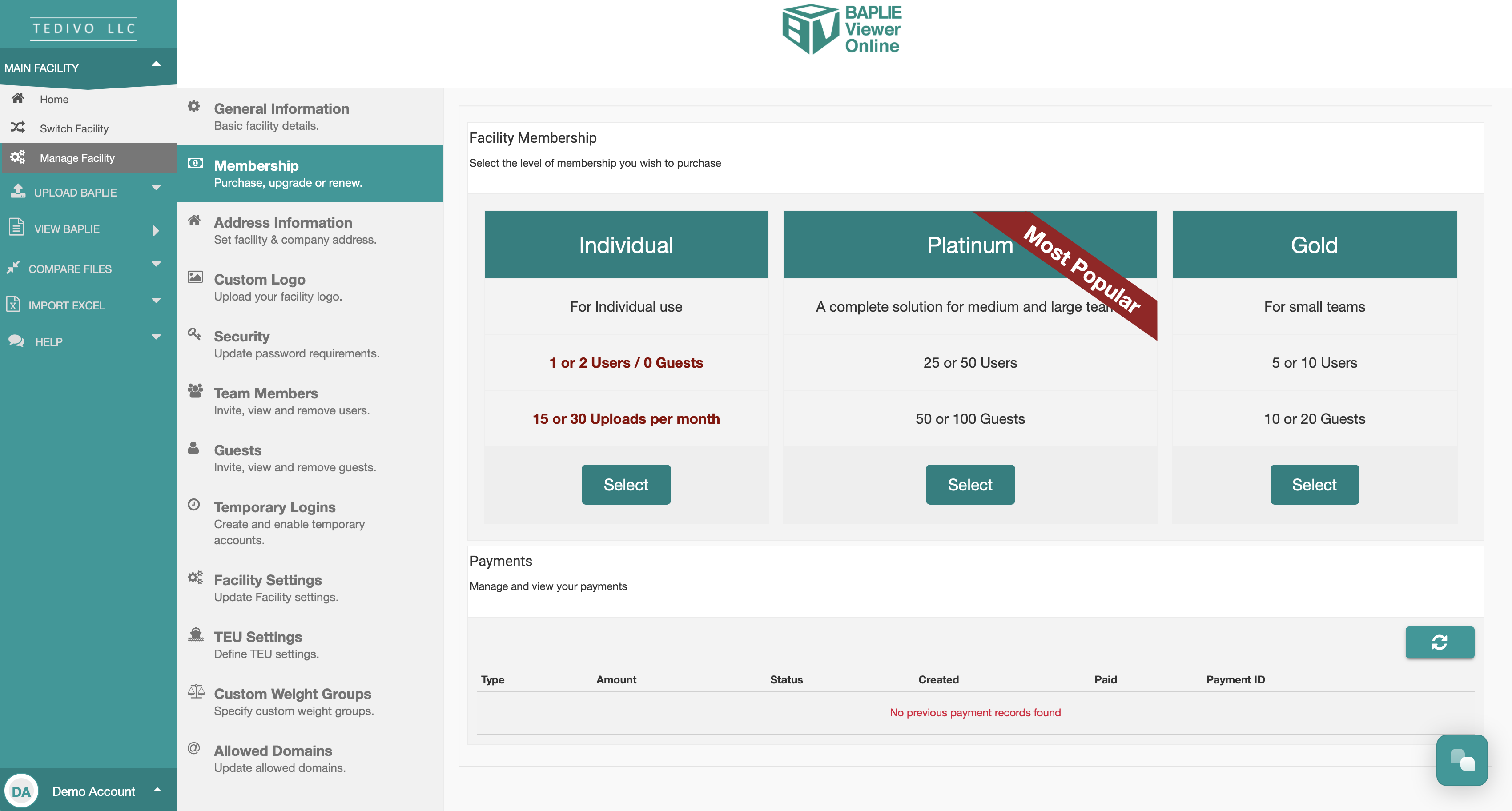 When you create an account with BAPLIE Viewer Online, you automatically have access to the Free Trial membership for 30 days. To upgrade your membership to Gold or Platinum for a monthly or annual subscription, visit the Manage Facility section in the top left corner of the screen (under the name of your facility) and then click Membership.