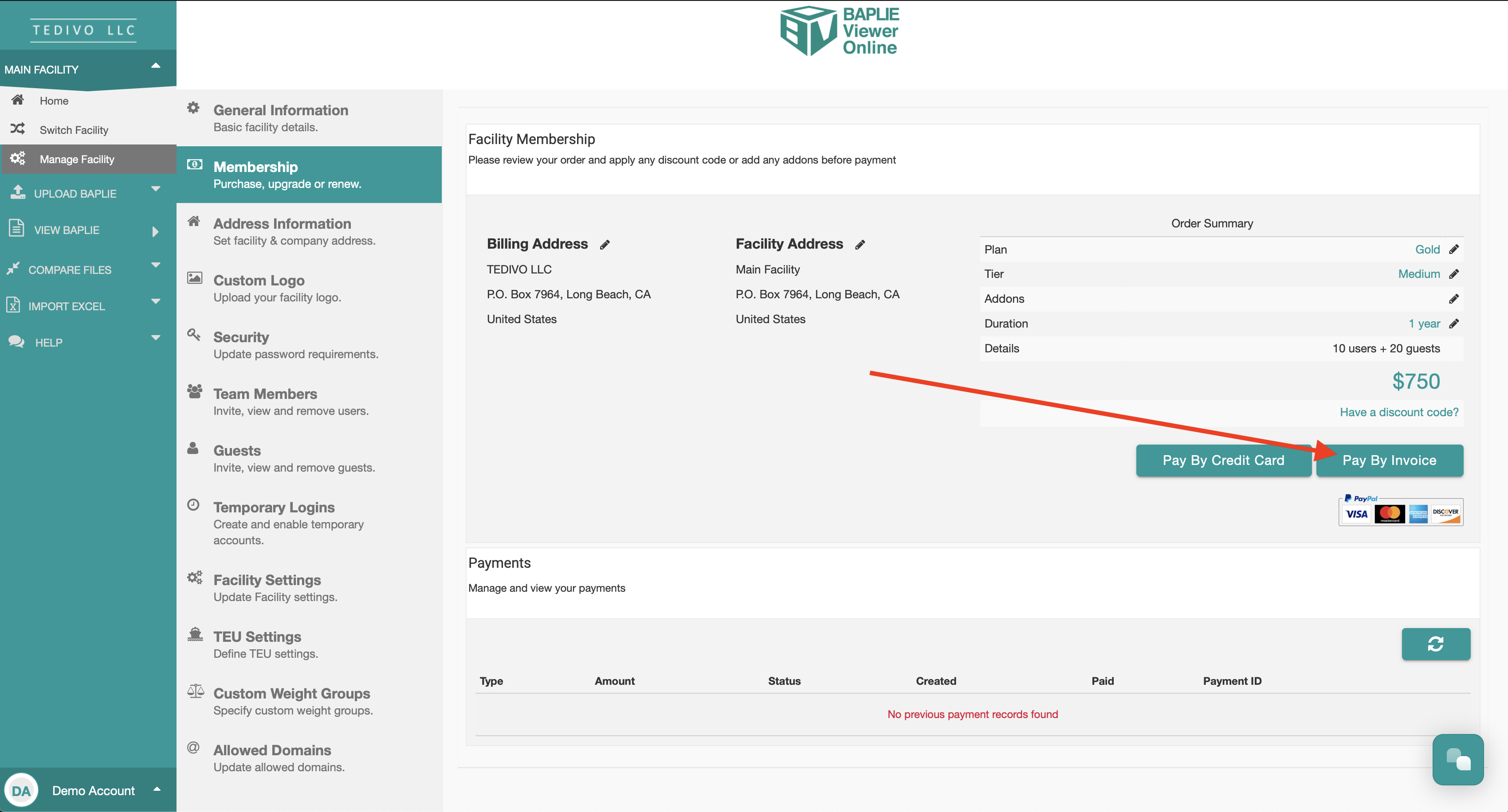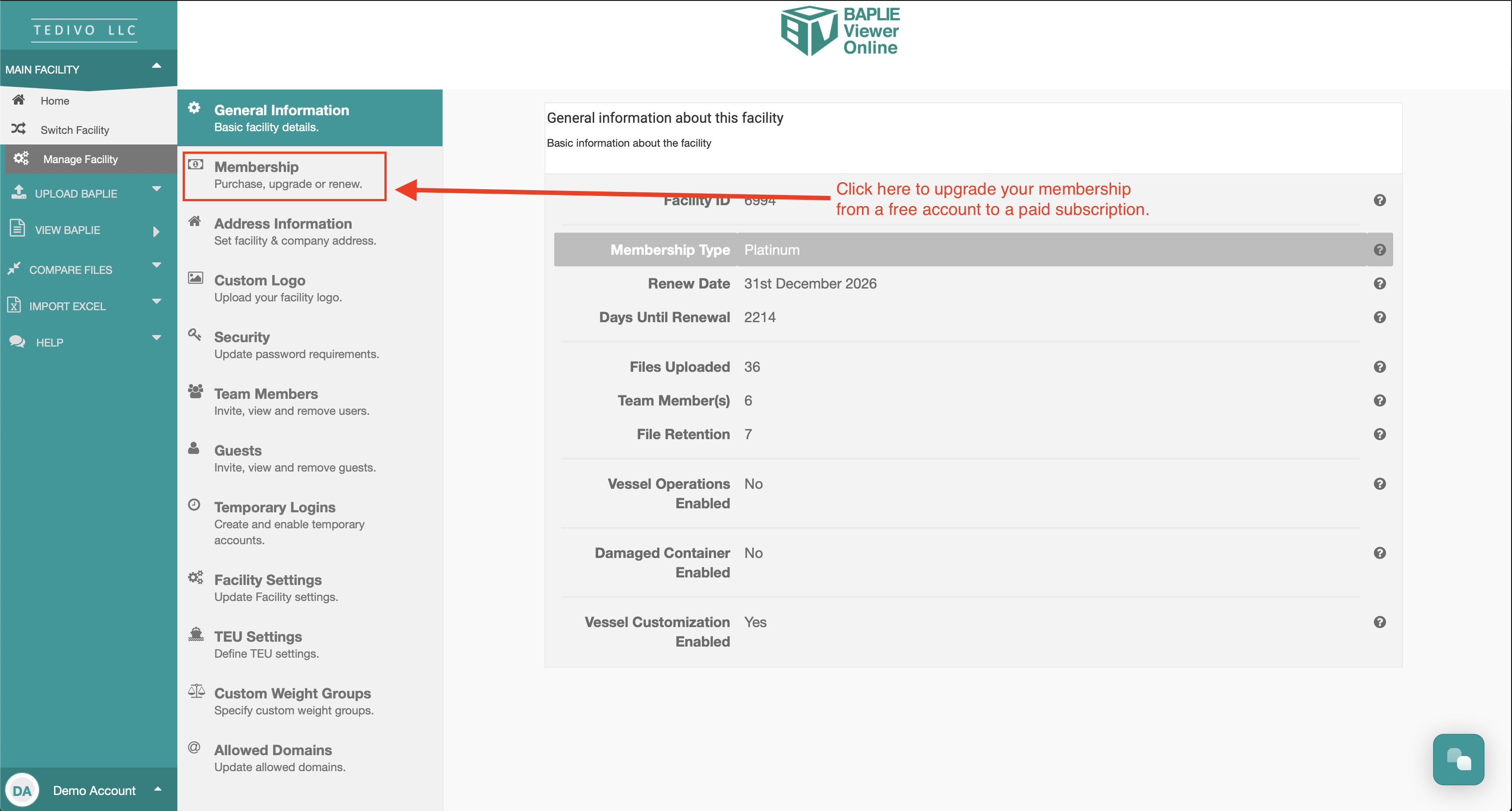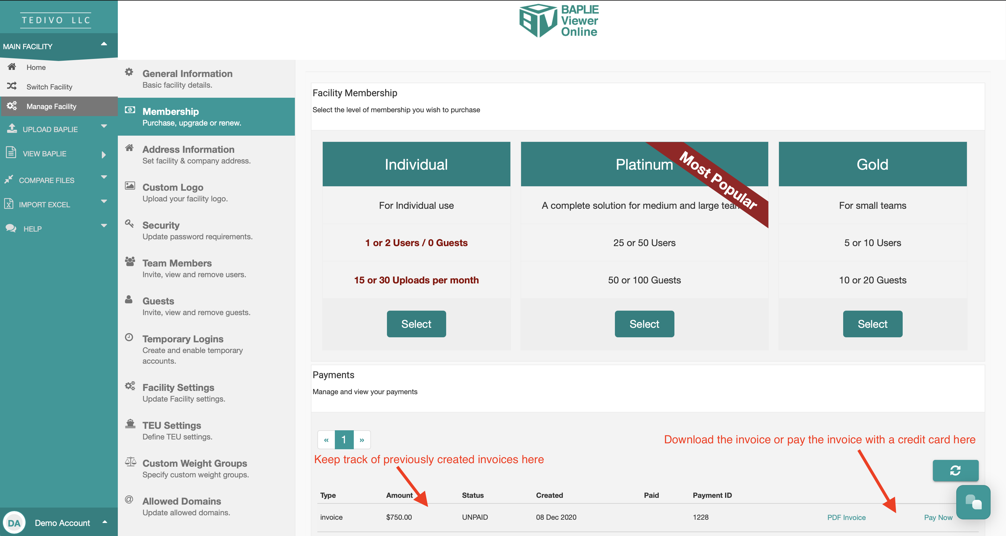 When you create an account with BAPLIE Viewer Online, you automatically have access to the Free Trial membership for 30 days. To upgrade your membership to Gold or Platinum for a monthly or annual subscription, visit the Manage Facility section in the top left corner of the screen (under the name of your facility) and then click Membership.
