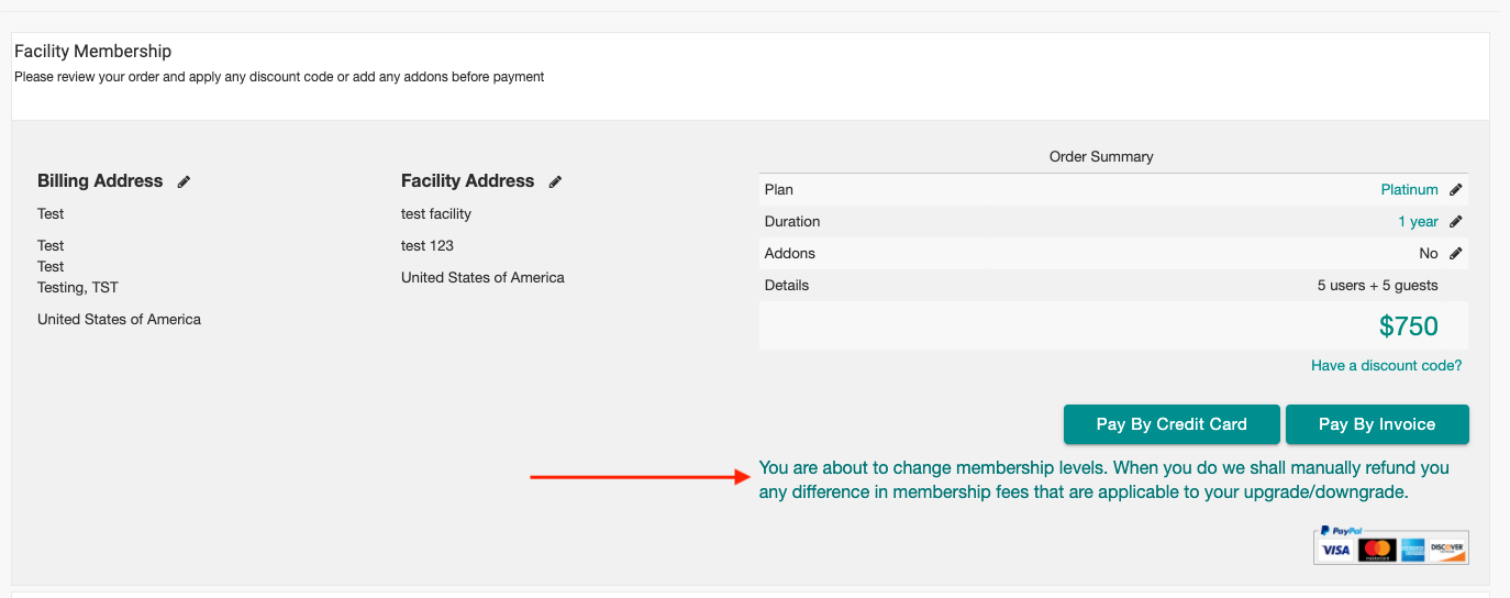 When you reach the payment page, you will notice a message appearing below the options for paying by credit card or invoice. This message alerts the system that you are changing membership levels during an otherwise active membership.