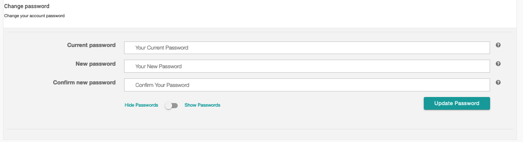 You will need to enter your current password, your new password and confirm the password by typing it in a second time. You can also toggle Hide Password/Show Password to make it temporarily visible while you type it in.