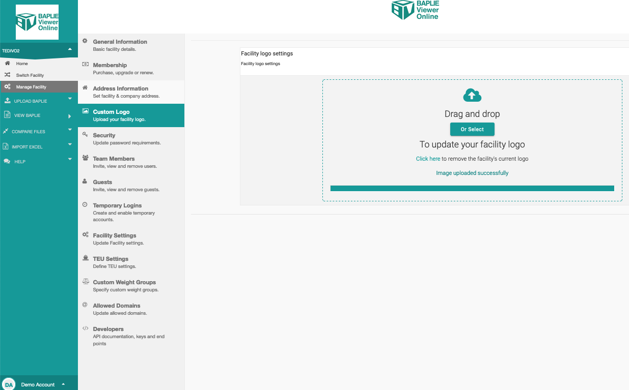 Once a file has been selected, the screen will automatically update to show the logo in the top left corner of the screen. This will update the logo for all user and guest accounts associated with your facility. You can also remove or change the current logo using the same uploader function.