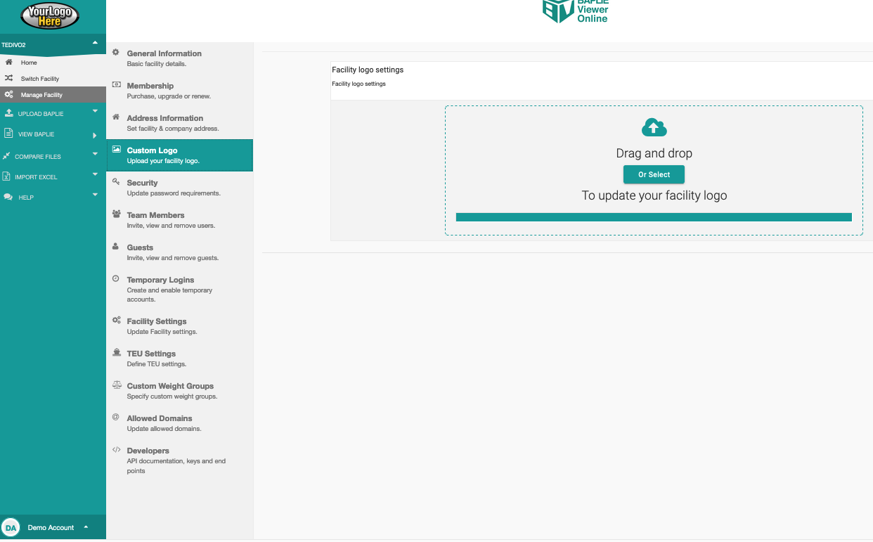 This article describes how the main user or administrator of the facility's account can upload a custom logo for the facility, to be shown on all user accounts at the top left of the page. This custom logo is displayed on the top left of the function menu. This can help accounts who have multiple facilities better differentiate between each facility and avoid mixing up files.