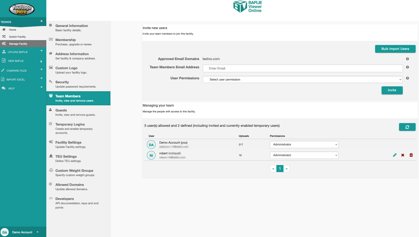 Upon logging in to baplieviewer.com, the homepage will load and a Function Menu will be displayed on the left side of the screen. Click "Manage Facility" under your facility's name which is the first menu option. Then click Team Members to invite, view and remove guests from your team.