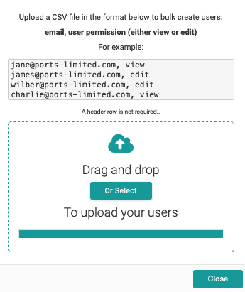 You can also use the Bulk Import Users function to send out multiple invites at once. To do so, you will need a .csv file in the specified format: email, user permission (view or edit). A header row is not required but the separation by a comma is required.