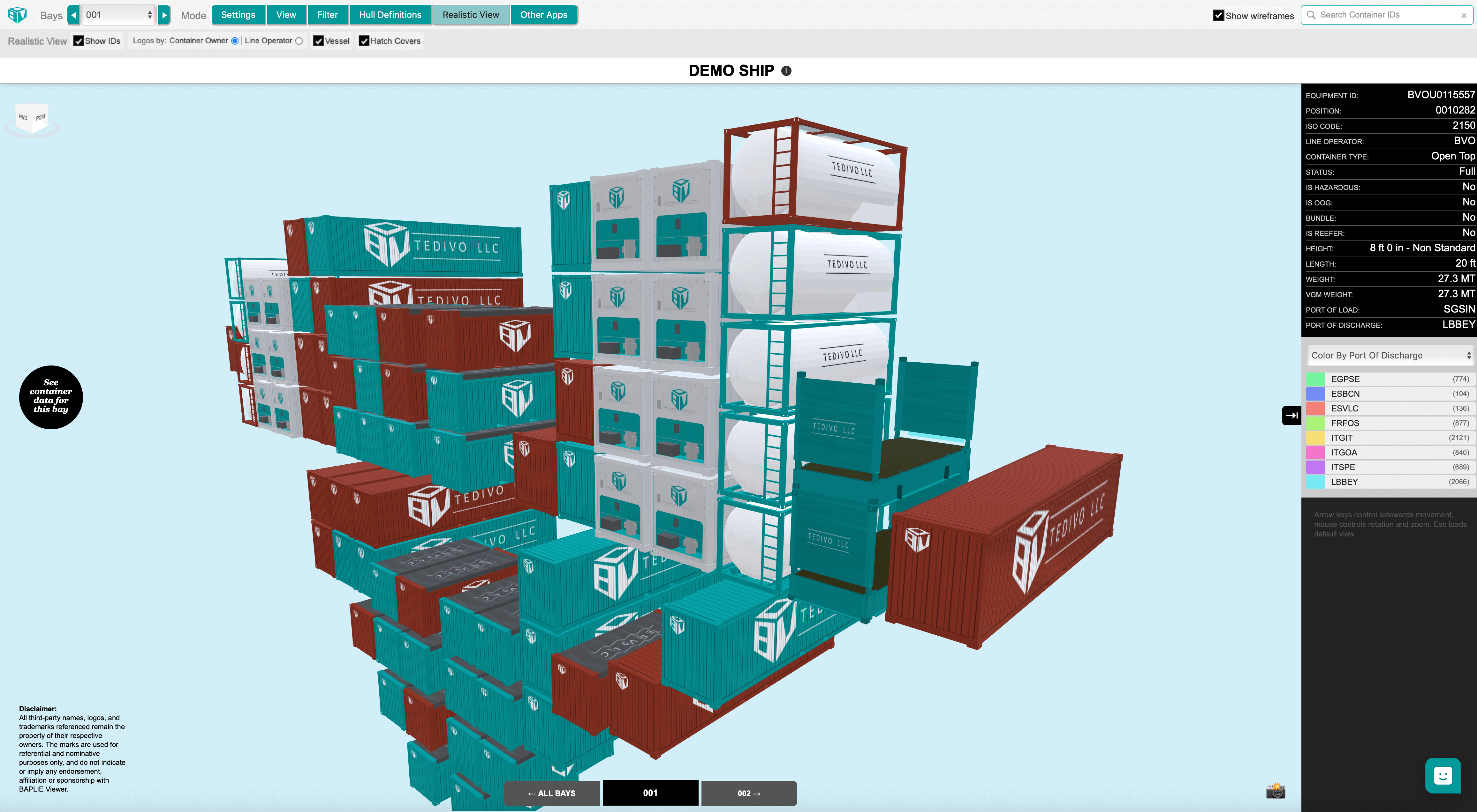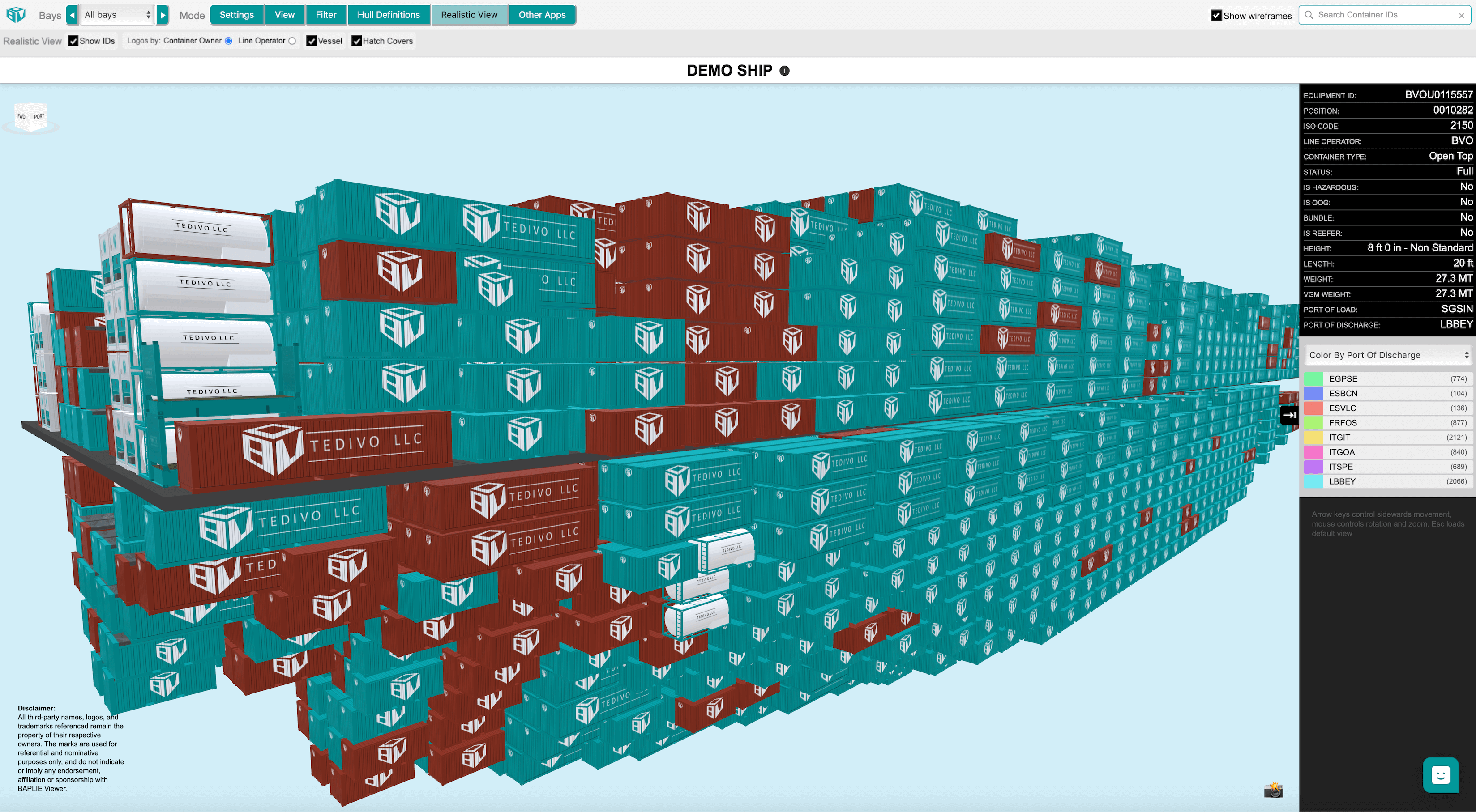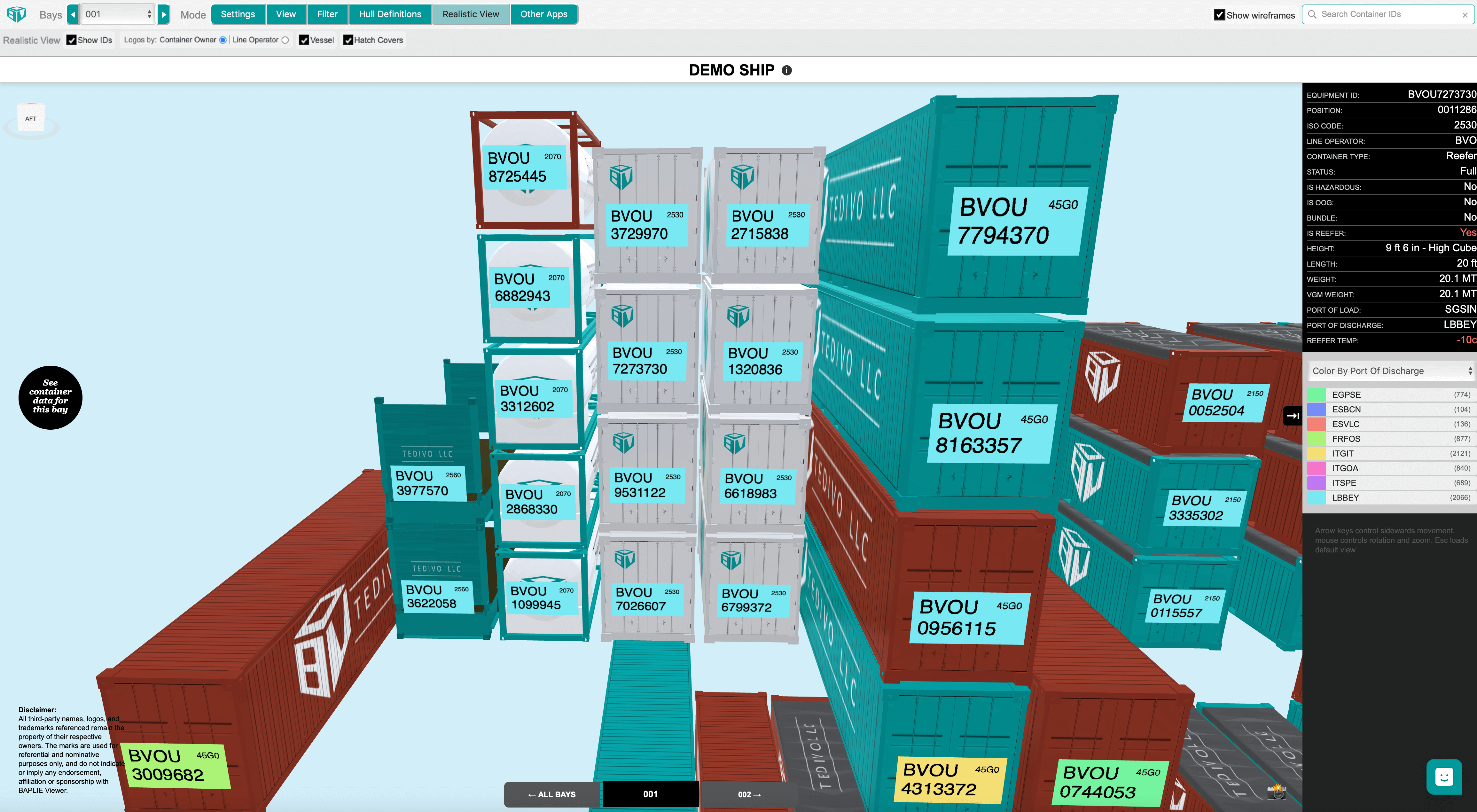 With BAPLIE Viewer Online, you can access the 3D Vessel View under the Visualization tab in the Function Menu to see a realistic model of the uploaded vessel data. While in 3D Vessel View, it is possible to view a realistic version of the vessel by using data from the BAPLIE file to display containers with accurate colors and container owner logos.