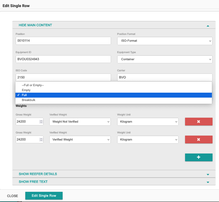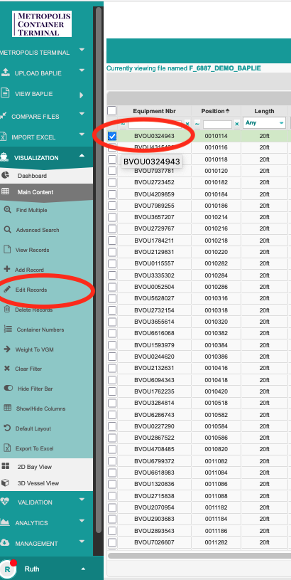 It is possible to edit any details of container data uploaded to BAPLIE Viewer Online using the Edit Records functionality. After a file has been uploaded to baplieviewer.com, the Dashboard will load. Click the Main Content option under the Visualization tab in the Function Menu to see the BAPLIE file content in a table format.