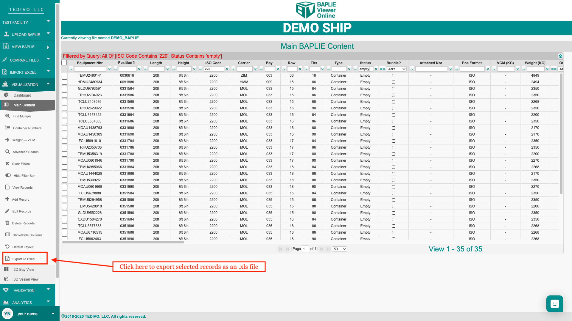 Once the Main Content screen has loaded, additional options for viewing the data will appear in the Function Menu. Click the "Export to Excel" option at any time to export the BAPLIE data on your screen into an .xls file.