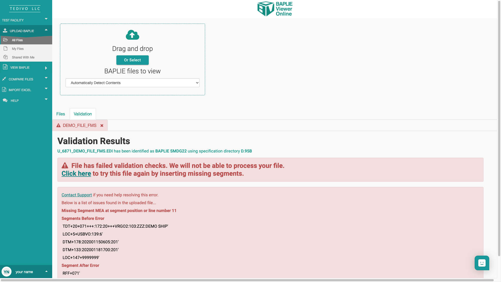 Files sometimes are sent with bad or missing data, and this can prevent them from being processed in a TOS or other system. BAPLIE Viewer Online's upload functionality has the ability to fix missing segments by highlighting them and allowing the user to quickly and easily insert mandatory information to make the file readable.