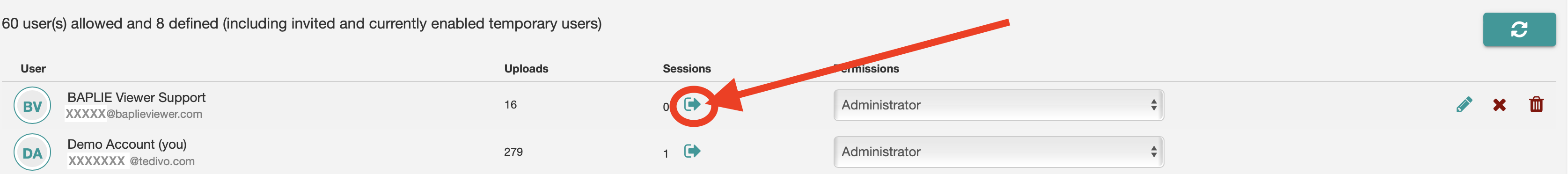 3) Locate the user that is not able to login from the list of users, and then click the LogOut icon next to their number of open sessions.