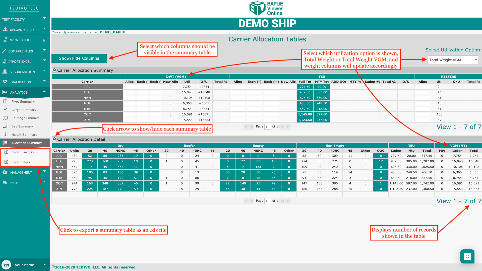 The automatically generated summary table includes the utilization by VGM or non-VGM weights, TEU counts, and number of reefers, as well as the ability to add custom allocations and easily visualize the percentage of utilization. It is also possible to export these summary reports to Excel.