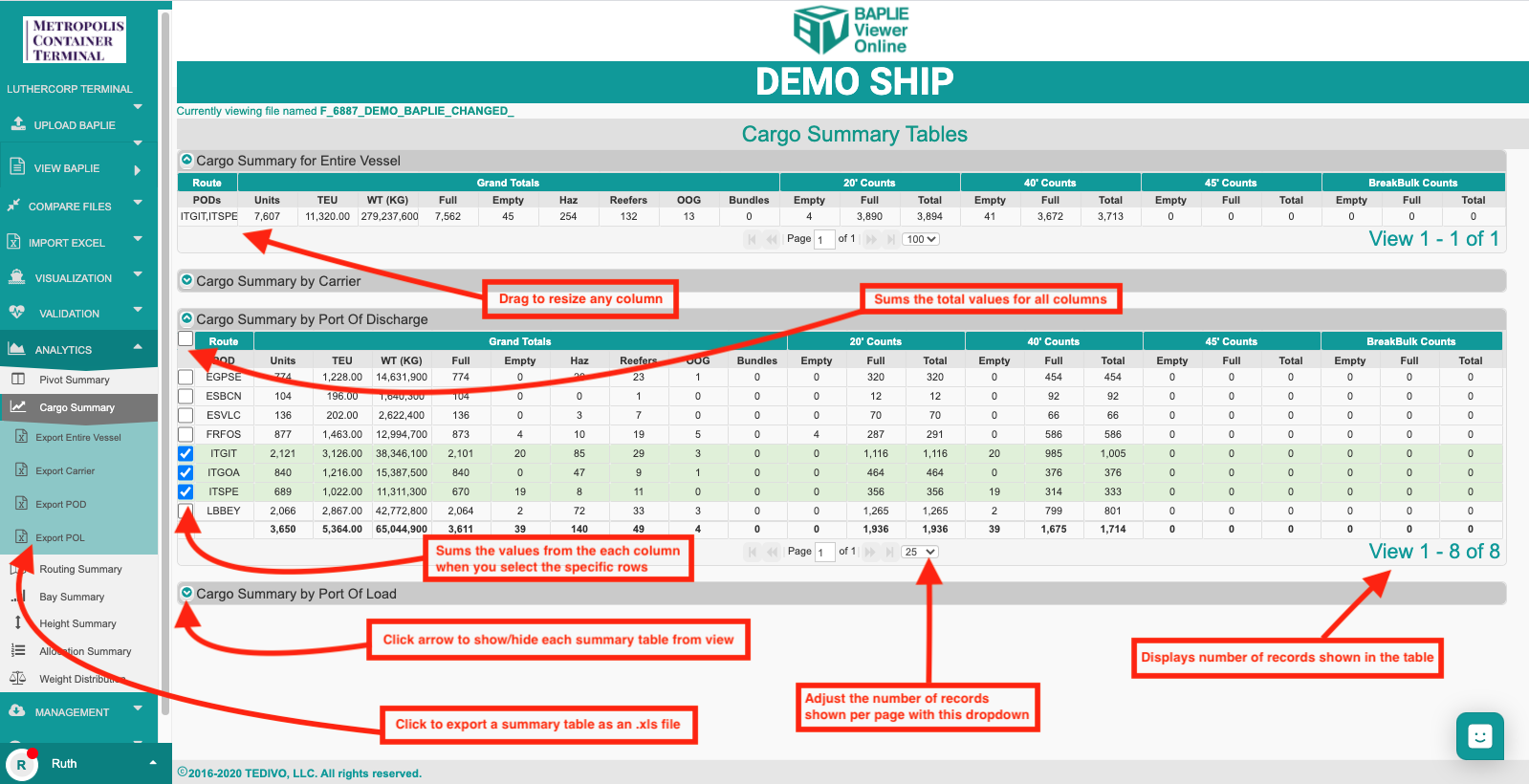 Click on Analytics in the Function Menu to view summary reports of the uploaded BAPLIE data. Select Cargo Summary to display summaries for the entire vessel, by carrier, by port of discharge, and by port of load. It is also possible to export these summary reports to Excel.
