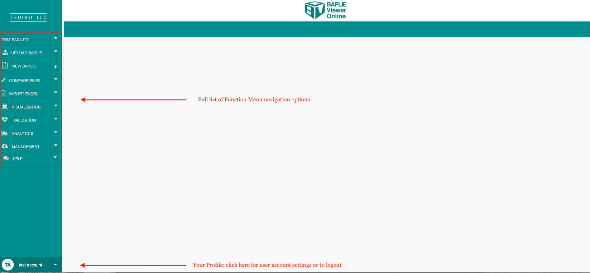 After logging in to your account on baplieviewer.com, you will use the Function Menu on the left side of the screen to navigate the different features of the website. For all view and edit functionality options to appear, you will need to first upload a BAPLIE file.