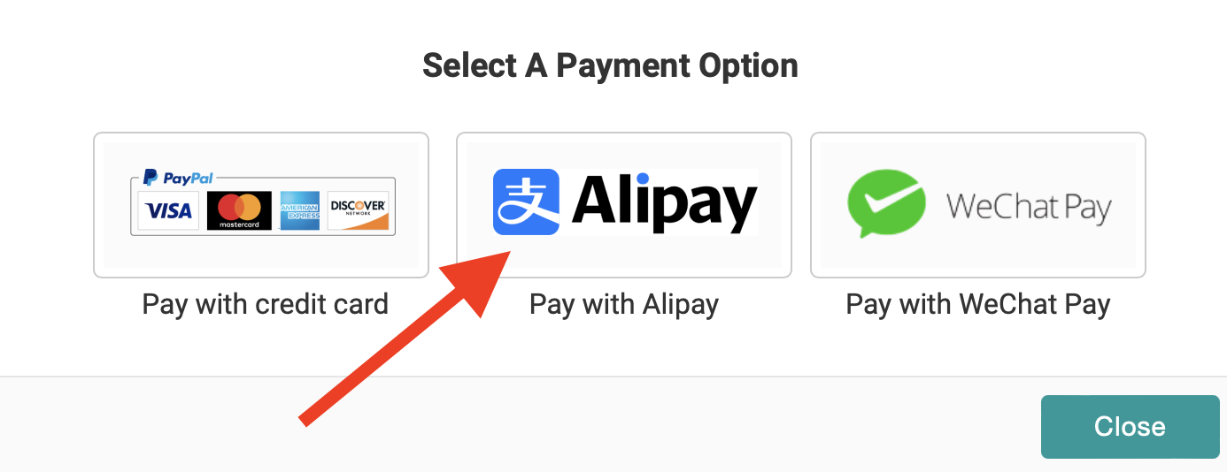 In addition to paying with a Credit Card, we also offer additional payment methods such as Alipay.