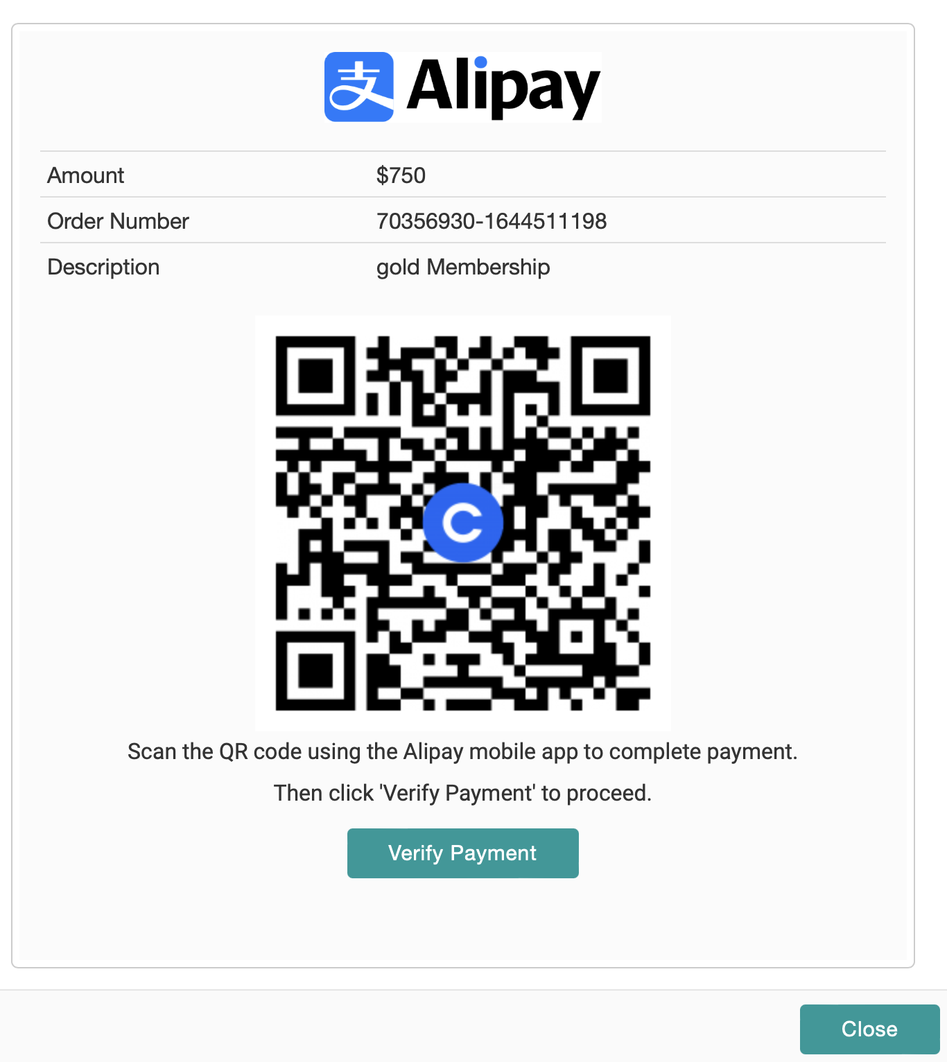 Once you select this option, a form will be displayed with a QR code that you can scan with the Alipay application.