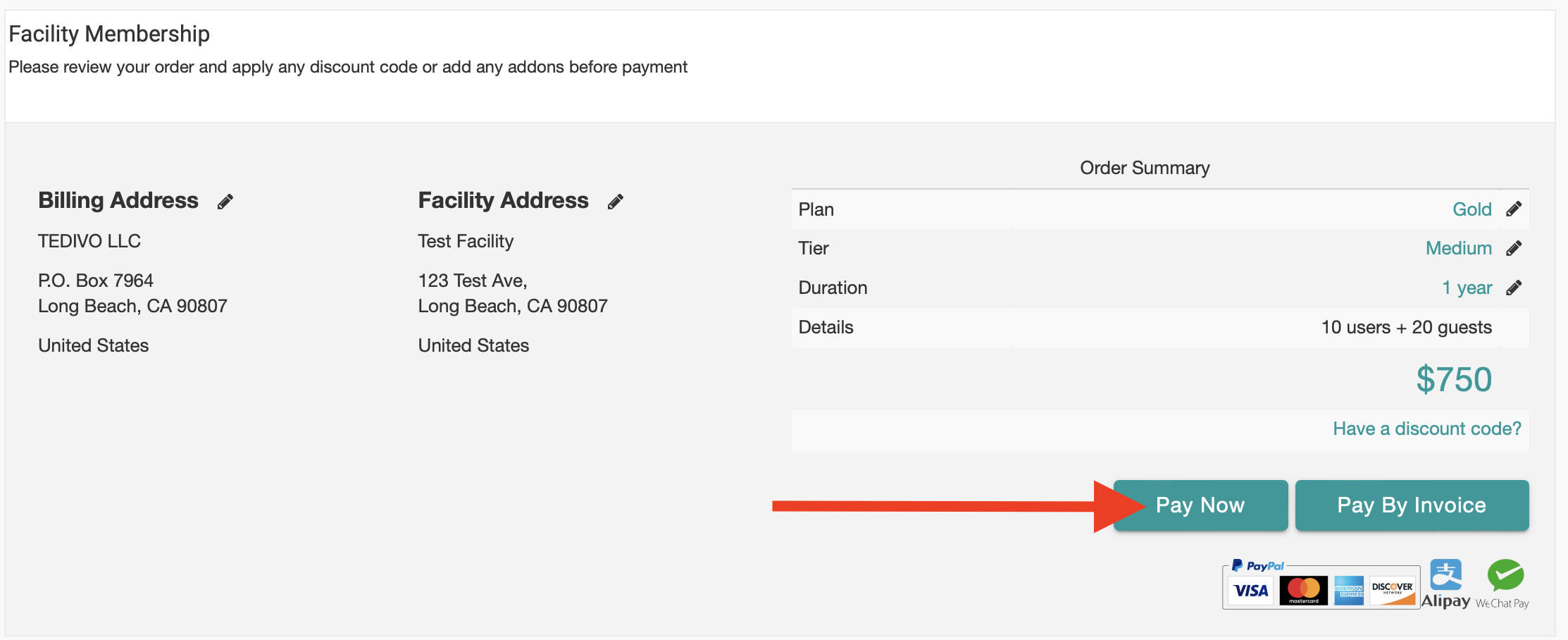 Select a membership type from the options provided, depending on your organization's needs. After entering all required information, the final payment page will allow you to either create an invoice to be paid later, or Pay Now.