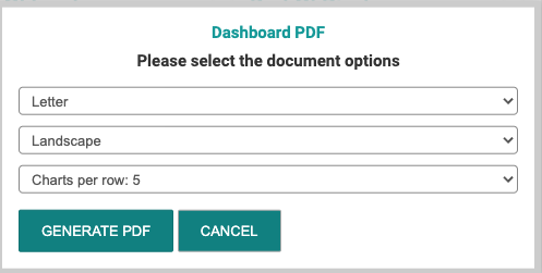 You can also download or print a PDF of the dashboard and share it with your team by using the left hand navigation bar and selecting "Export to PDF". Options on paper size, orientation and charts per row are available.