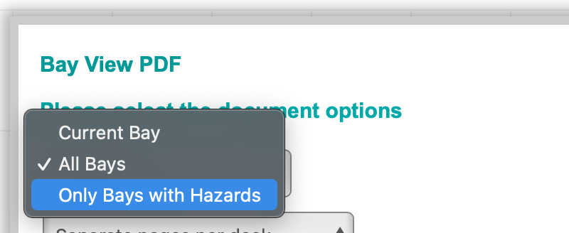 - Print Hazardous Cargo - When the Hazards View is checked, click Bay View PDF to see new options for printing the bay.