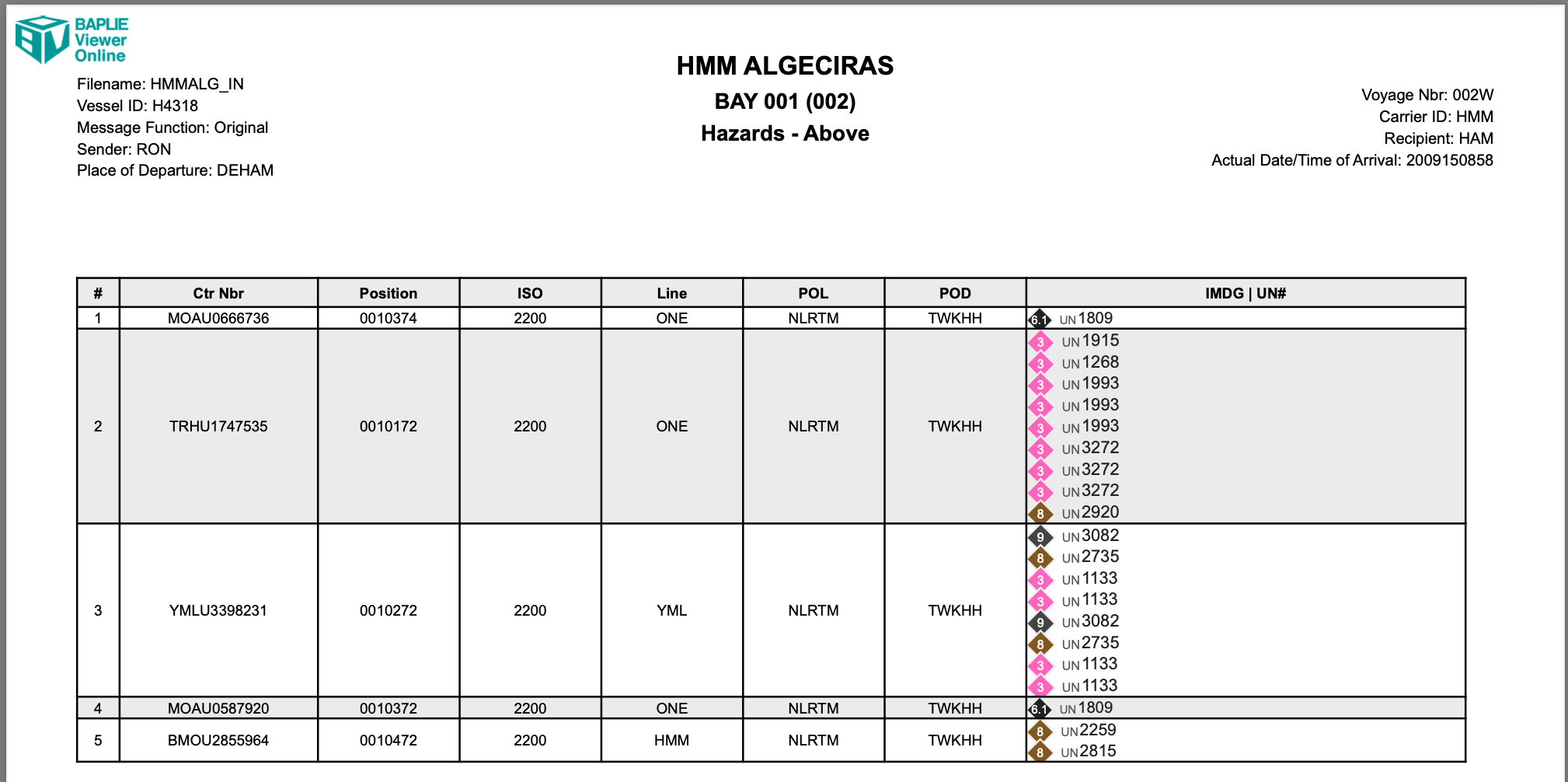 - The PDF generated will include a table after each bay showing the details of the hazardous cargo.