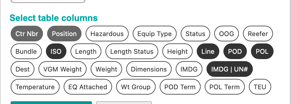 - After each bay, there will be a table listing the hazardous cargo. You can select which columns of data to display in this table.