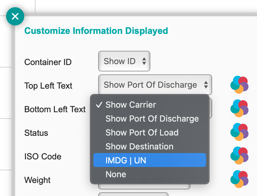 - Add UN Number to Icon - If you wish to display the corresponding UN Number as well as the IMDG Number within the Container Icon, this can be done by selecting the Settings mode, and then click Customize Info. You can then change "Bottom Left Text" to IMDG | UN as shown below