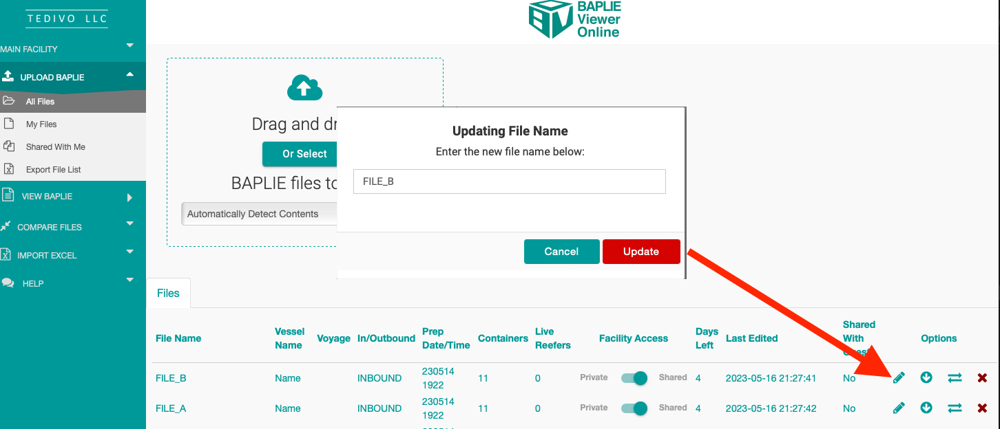 - From the File Upload page, click the pencil icon on the right of the table of files to open a prompt for a new file name. Input the new name and click Update when done.