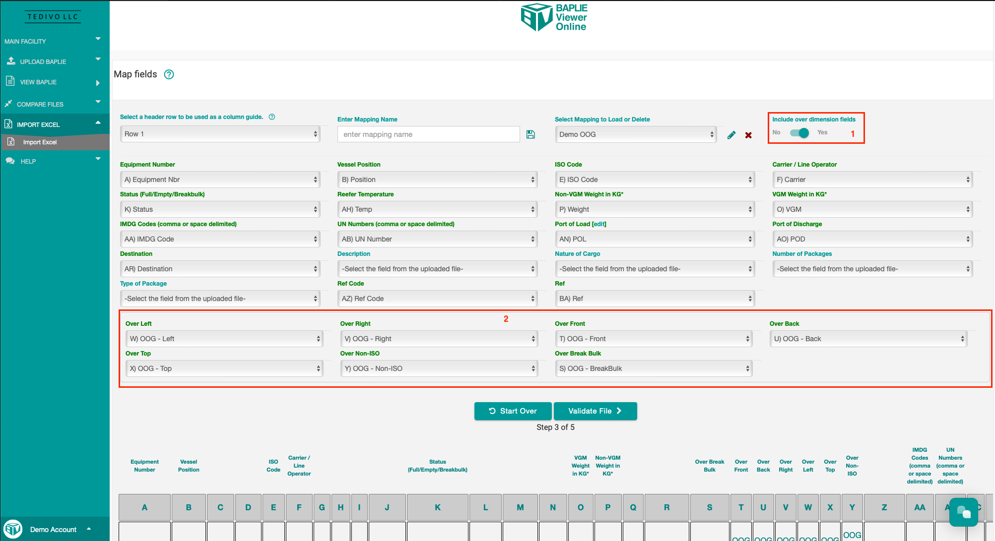 - Out of Gauge dimensions are now supported by the Import from Excel feature. If the data you are importing contains OOG measurements, simply toggle the "Include over dimension fields" to Yes, and then select which columns contain the measurements for each OOG attribute.